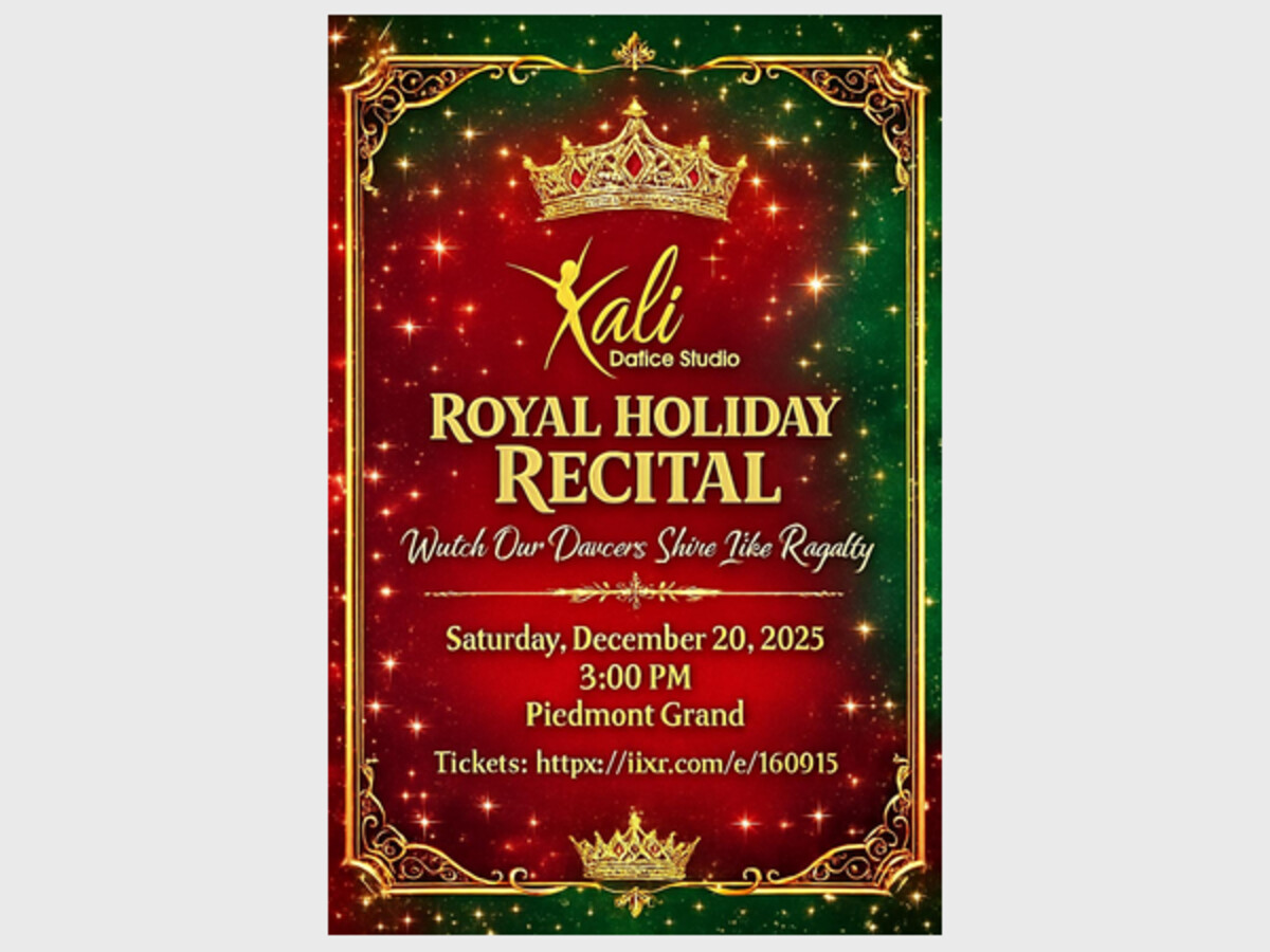 Kali Dance Studio for the Arts will present Royal Holiday, where "dancers shine like royalty," on Saturday, December 20th, from 3 to 5 p.m.