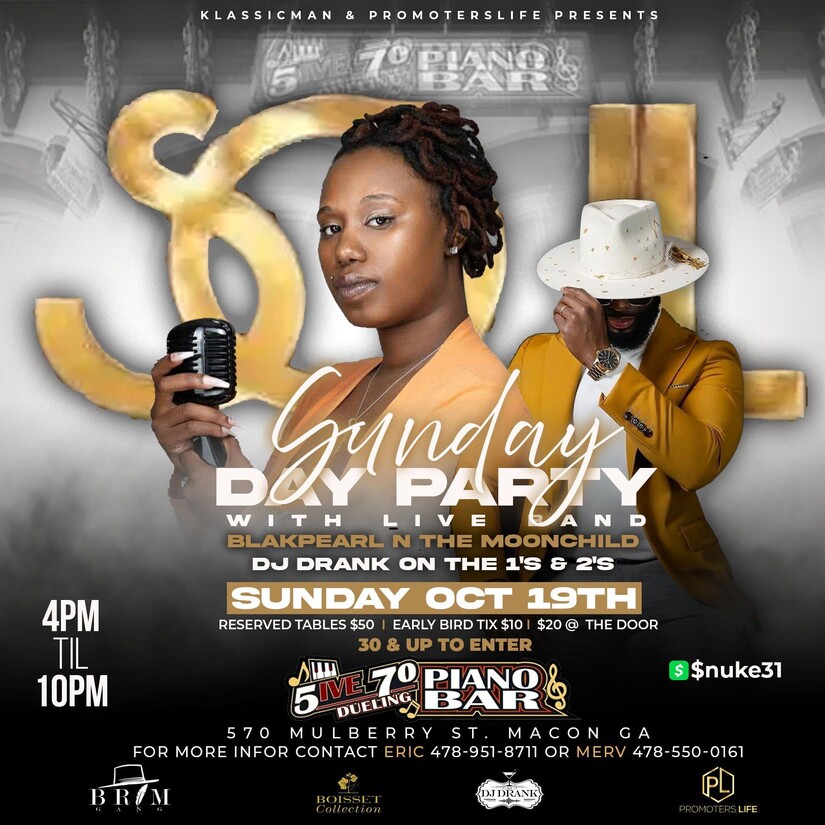 Soul Sunday features live performances from Blak Pearl n The Moonchild, DJ sets from DJ Drank, and adults having fun while dressed to impress. Visit 5ive70 Dueling Piano Bar’s Facebook page for more information about this event. Reserved tables for Soul Sunday are $50, while general admission tickets cost $20 at the door.