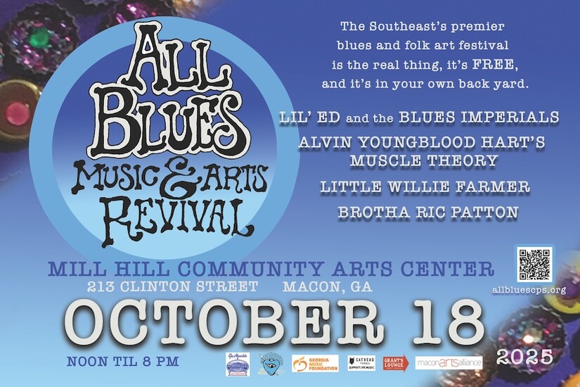 The All Blues Music & Arts Revival returns to Macon this Saturday with live blues music from Brotha Ric (12 p.m.), Willie Farmer (2 p.m.), Alvin Hart (4 p.m.), and Lil’ Ed (6 p.m.). There will also be an exhibit of Southeastern folk art, as well as a paint project for kids. The All Blues Music & Arts Revival is family-friendly and free to attend.