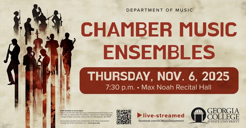 Georgia College & State University will present a Chamber Music Ensembles concert with small strings, winds, brass, percussion, keyboard, Jazz, and vocals ensembles playing music from across the ages. This Chamber Music Ensembles Concert will also be livestreamed online at this link. A $5 donation per attendee is encouraged: online donations can be made at this link , with all proceeds benefiting the GSCU Department of Music.
