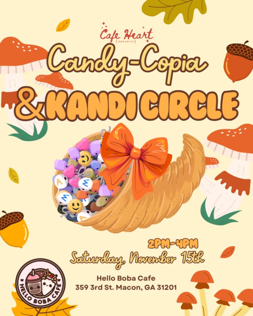 Cafe Heart Projects will host a unique crafting event at Hello Boba Cafe this Saturday featuring Candy Cornucopias, which are sugar cones filled with candy and sweets to create personalized fall trail mixes. The Kandi Station will also be available to make colorful accessories while socializing with other attendees. Free parking is available at the 367 Mulberry Street Lane garage with an entrance near the Douglas Theater. The Candy-Copie & Kandi Circle is family-friendly and free to attend.