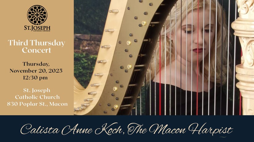 Middle Georgia harpist and Mercer University professor Calista Anne Koch performs at St. Joseph Catholic Church this Thursday for St. Joseph’s Third Thursday Concert series. Concerts in the Third Thursday Concert are free and open to the public.
