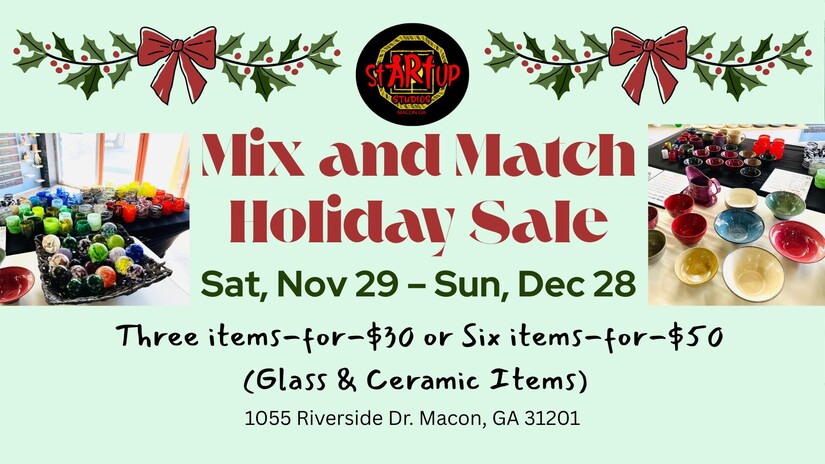 stARTup Studios will be having a Mix and Match holiday sale this Saturday. Shoppers can choose handmade glass and ceramic items from stARTup's sale tables for 3 for $30 or 6 for $50. stARTup Studios is open from 12 to 8 p.m. on Saturdays and 1 to 7 p.m. on Sundays.