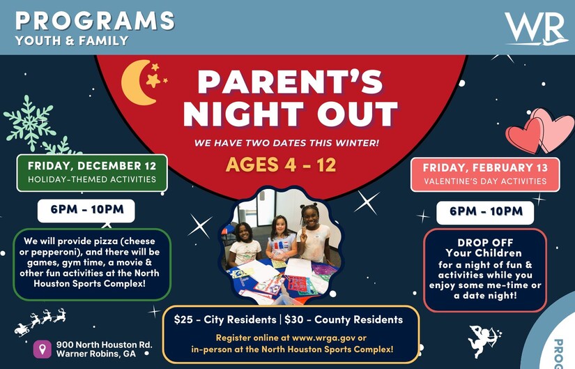Warner Robins Recreation, Cultural Services is offering parents a way to keep their kids entertained while they get away for a night together this Friday evening. Kids will play games, eat cheese and pepperoni pizza, take part in gym activities, as well as crafts, according to the organizers. Tickets for Parent’s Night Out cost $25 for Warner Robins' residents and $30 for Houston County residents.