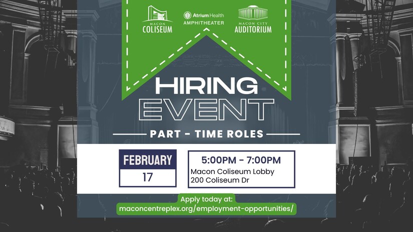 Part-time jobs are available with the Macon Coliseum, Macon City Auditorium, and Atrium Health Amphitheater at this hiring event in the Macon Coliseum’s lobby on Tuesday. Roles include: Suite Attendant, Bartender, Food & Beverage Lead, Ticket Seller, Dishwasher, Sous Chef, and more. Applicants must apply online at this link. There is no charge to attend this hiring event.