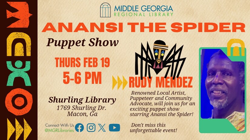 Artist, puppeteer, and community advocate Rudy Mendez will present a puppet show that tells the story of Anansi the Spider. The Akan people from present-day southern Ghana have long included stories of Anansi the Spider in their religion and folklore. There is no charge for this fun educational event.
