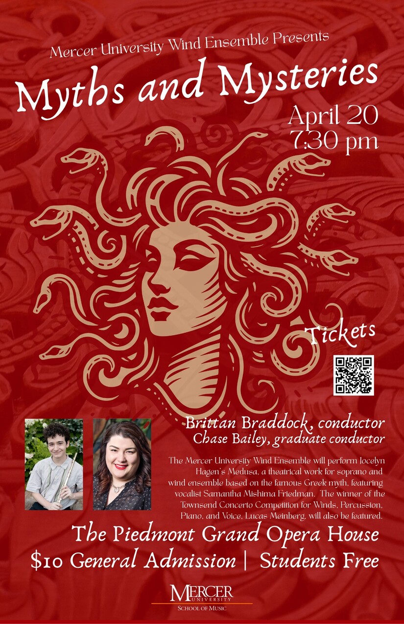 Conductor Dr. Brittan Braddock will lead the Mercer University Wind Ensemble as they perform Jocelyn Hagen’s Medusa, along with vocalist Samantha Mishima Friedman, during their season finale. Flutist Lucas Meinberg, winner of Mercer’s Townsend Concert Competition for Winds, will also perform, while Mercer Graduate Conductor Chase Bailey will conduct “Divertimento”. Tickets for Myths and Mysteries cost $10, but students receive free entry.