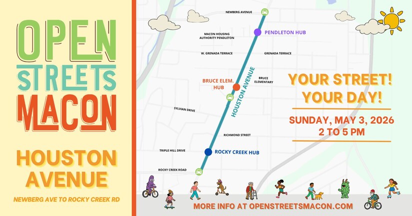 >> Sunday, May 3rd > 2-5 p.m. Open Streets Macon: Houston Avenue: Open Streets Macon creates a temporary park for the community from Newberg Avenue to Rocky Creek Road on Sunday. Open Streets Macon’s events are free and open to the public celebrations of public space that are meant to bring the community together to exercise and play.
