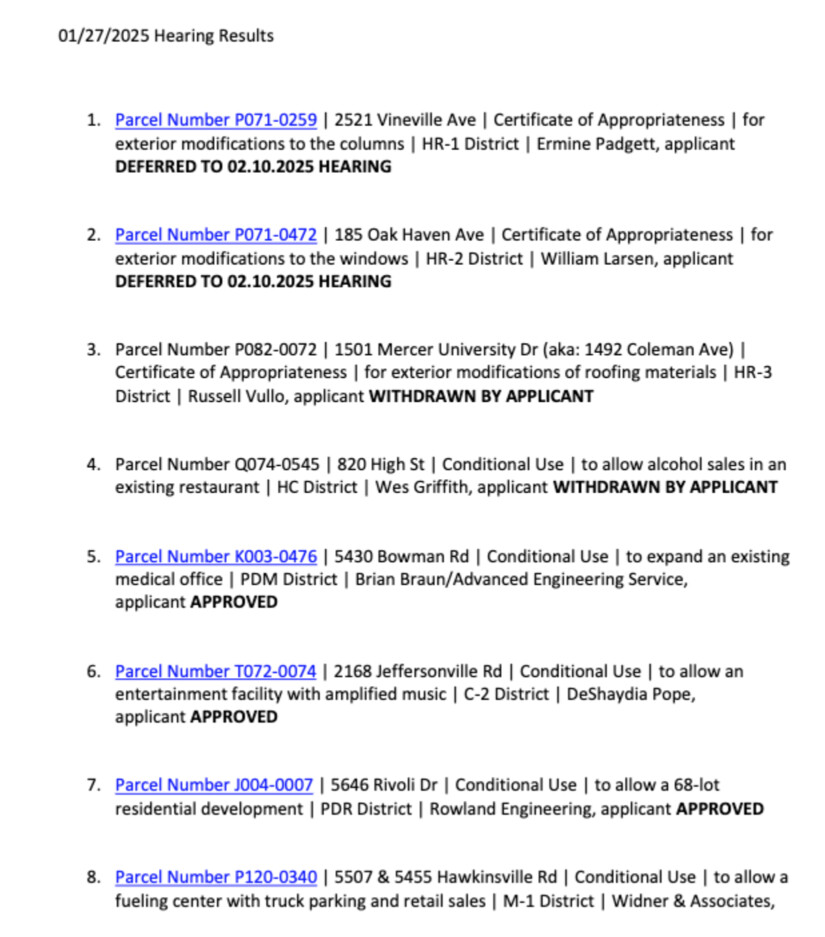 Macon-Bibb County Planning & Zoning Commission 1/27/2025 Hearing Results