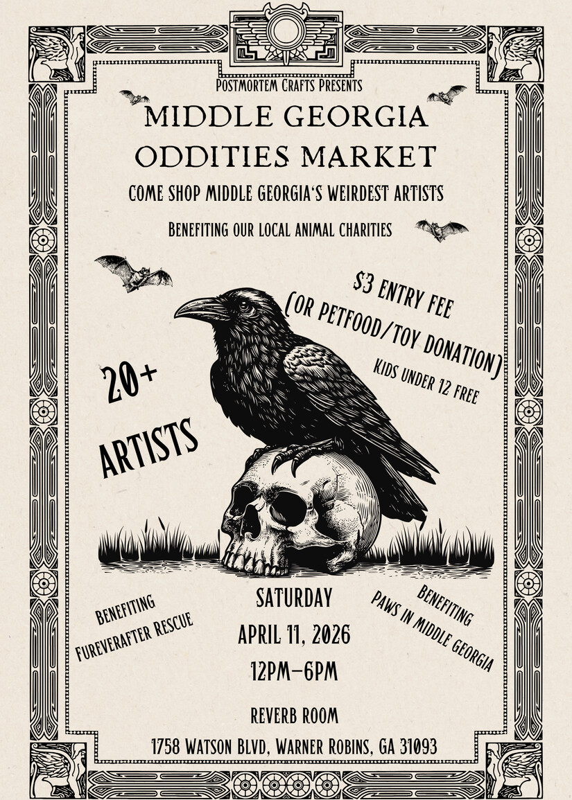 Hosted by Post Mortem Crafts, the Middle Georgia Oddities Market will feature a curated selection of vendors offering oddities, curiosities, taxidermy, preserved specimens, handmade art, jewelry, and other unusual creations not typically found at traditional craft fairs. In addition to showcasing local artists, the event will benefit local animal rescue organizations, including Furever After Rescue and Paws in Middle Georgia. Proceeds and donations collected during the market will help support animals in need throughout the Middle Georgia area.